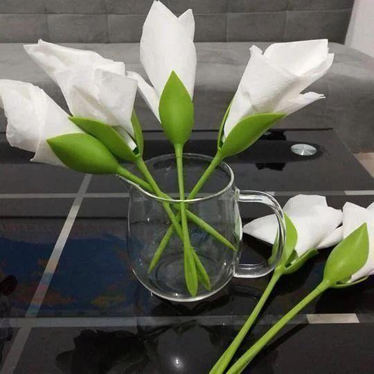 • Ingen expertis för servettvikning krävs; Ta bara tag i vilken servett som helst, vik den som bilden visar, skjut in den i en Bloom-hållare och vrid snabbt stången.